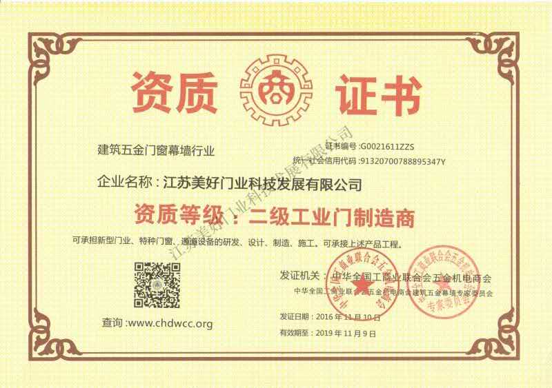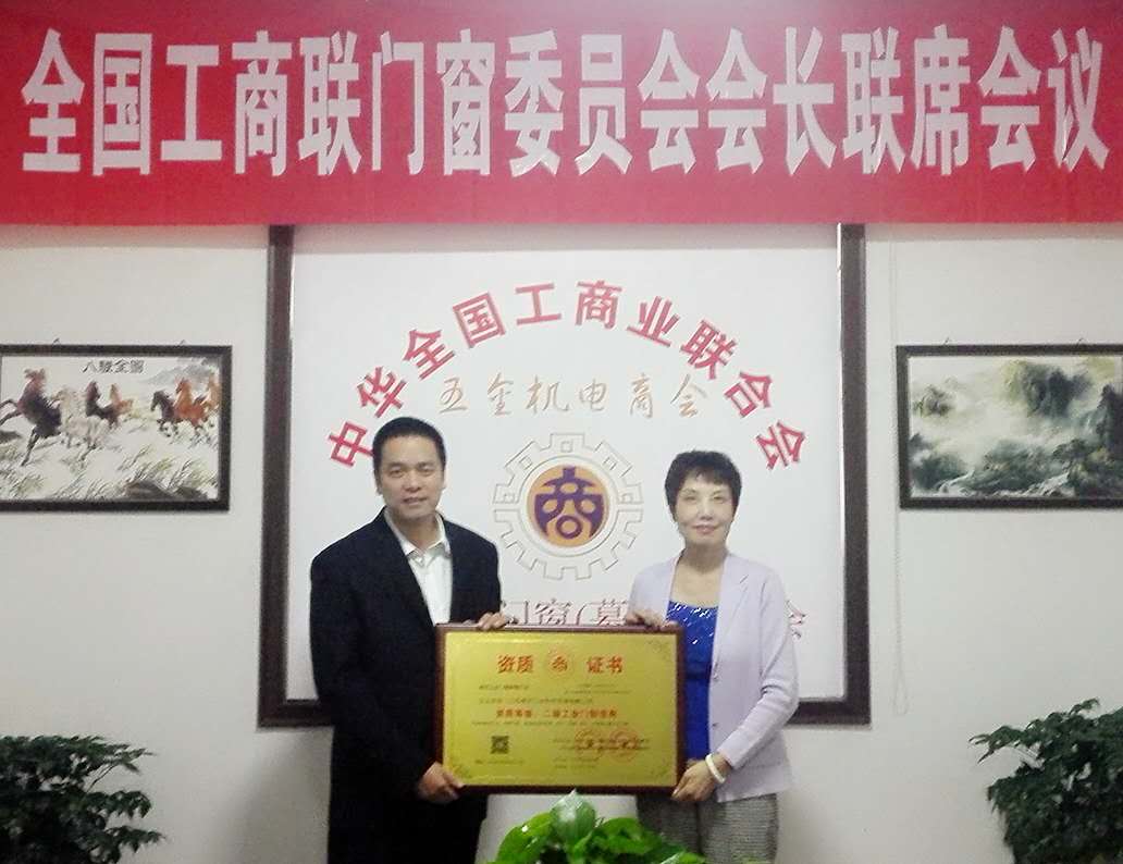 全國工商聯門窗委員會常務副會長隋曉麗女士為江蘇美好門業科技發展有限公司董事長潘國柱頒發“二級工業門制造商”資質證書