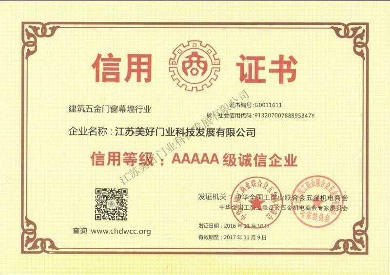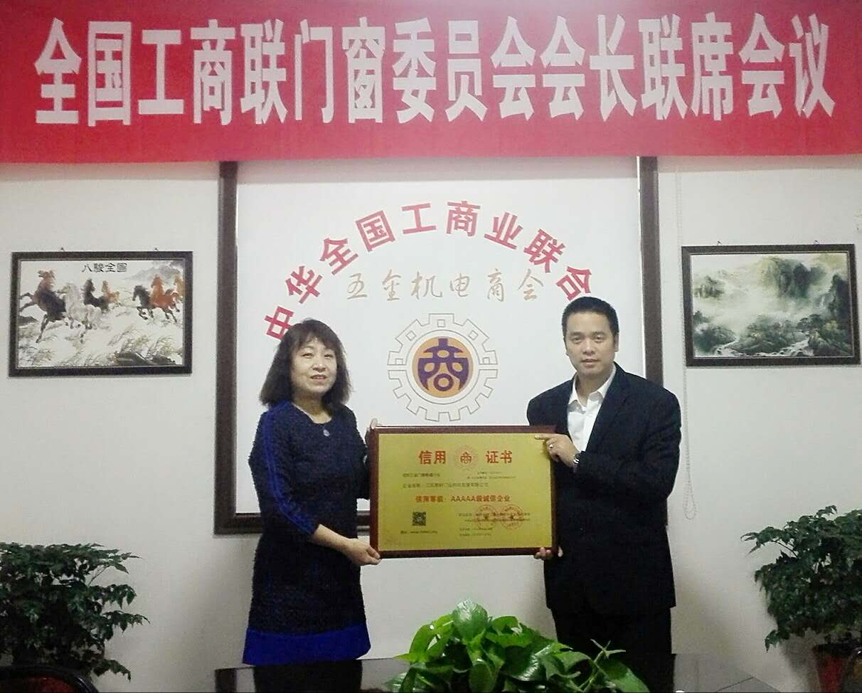 全國工商聯門窗委員會秘書長張秀梅女士為江蘇美好門業科技發展有限公司董事長潘國柱頒發“AAAAA級誠信企業”信用證書。