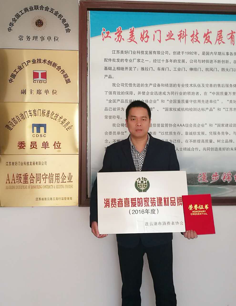 江蘇美好門業科技發展有限公司,在2016年度“家裝入萬家,消協伴您行”家裝建材評比活動中,被連云港市消費者協會授予“消費者最喜歡的家裝建材品牌”榮譽稱號。