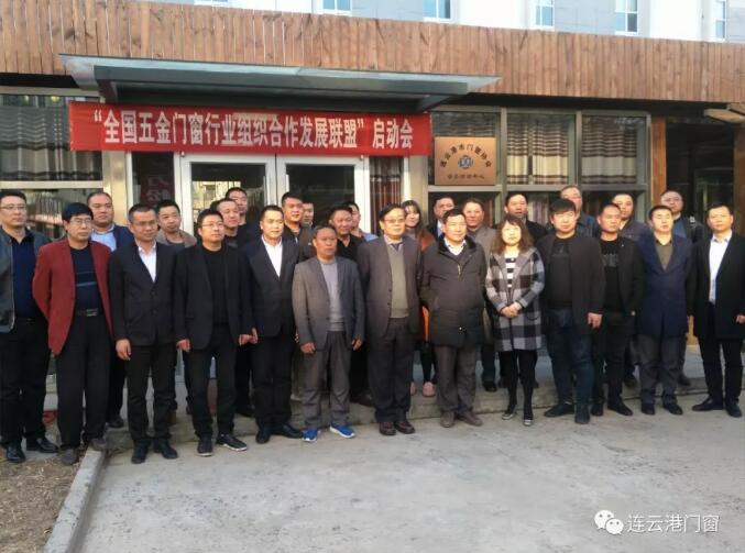 “全國五金門窗行業組織合作發展聯盟”各發起單位,在“連云港市門窗協會會員活動中心”門前合影留念。