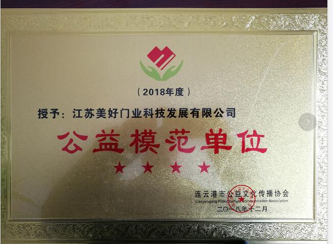 江蘇美好門業科技發展有限公司榮獲“公益模范單位”榮譽稱號。