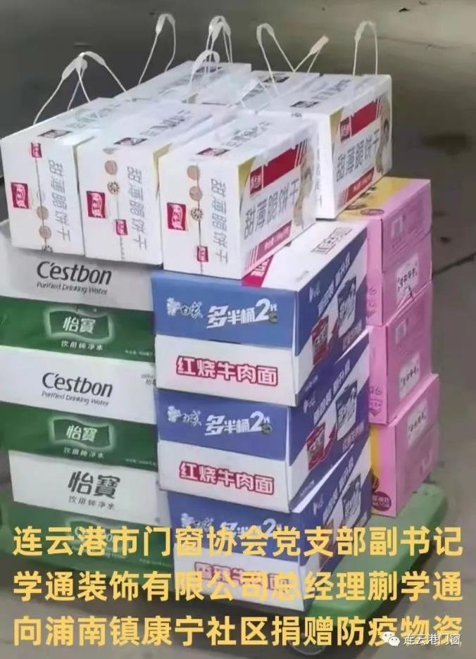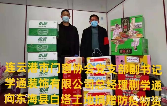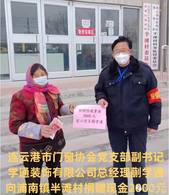 ? ? ??連云港門(mén)窗協(xié)會(huì)黨支部副書(shū)記(學(xué)通裝飾公司總經(jīng)理)蒯學(xué)通先后為東海縣白塔工地、海州區(qū)浦南鎮(zhèn)半灘村、浦南鎮(zhèn)康寧社區(qū)捐贈(zèng)現(xiàn)金及物資,累計(jì)8000元。