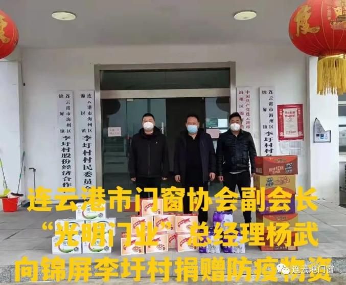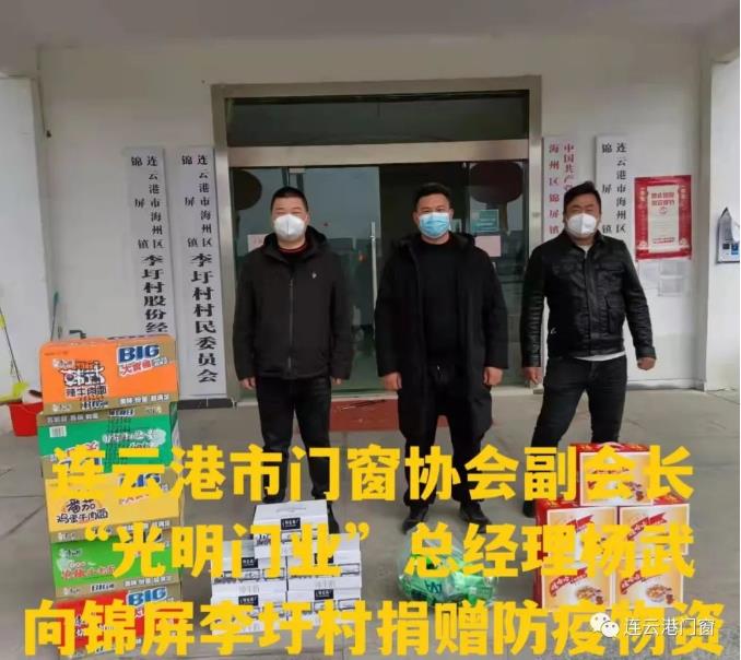 ? ? ?連云港市門(mén)窗協(xié)會(huì)副會(huì)長(zhǎng)(光明門(mén)業(yè)總經(jīng)理)楊武為錦屏鎮(zhèn)李圩村先后兩次捐贈(zèng)現(xiàn)金和防疫物資,累計(jì)5000元。
