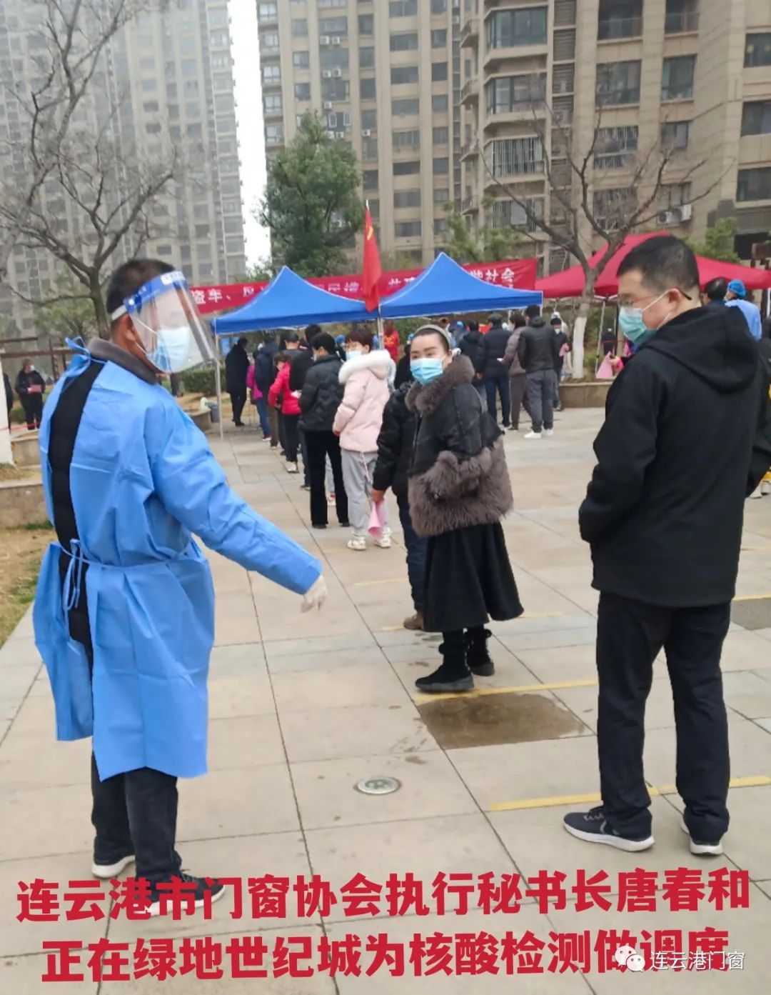 ? ? ??連云港市門(mén)窗協(xié)會(huì)執(zhí)行秘書(shū)長(zhǎng)(叁陸久裝飾總經(jīng)理)唐春和在“綠地世紀(jì)城”做自愿者參與抗疫工作。