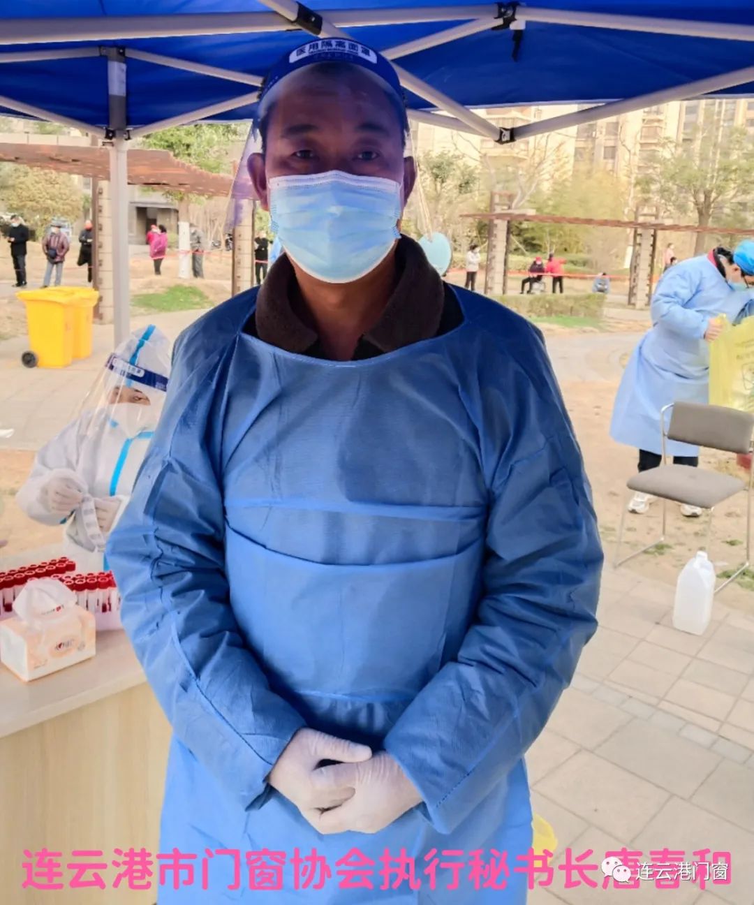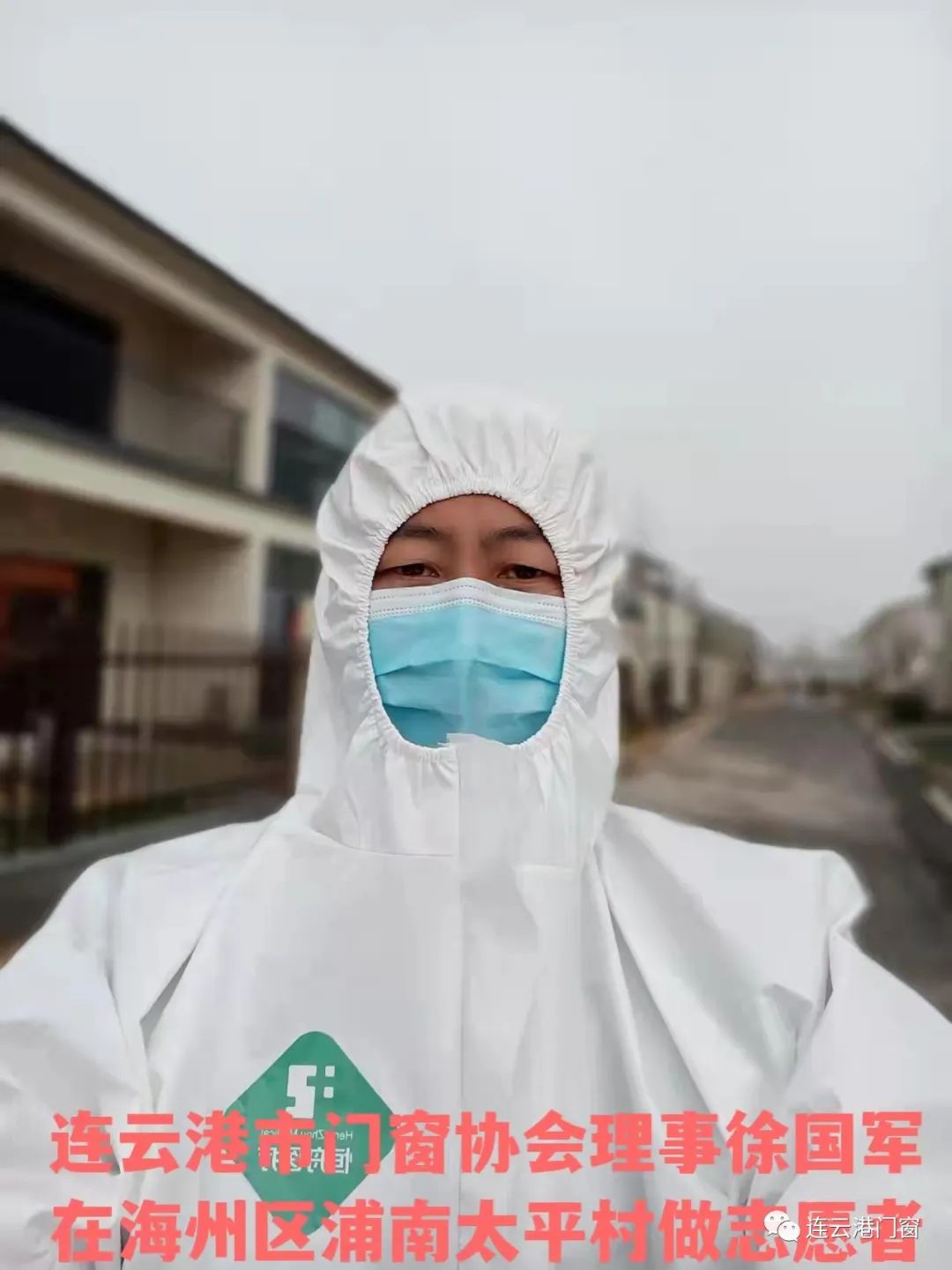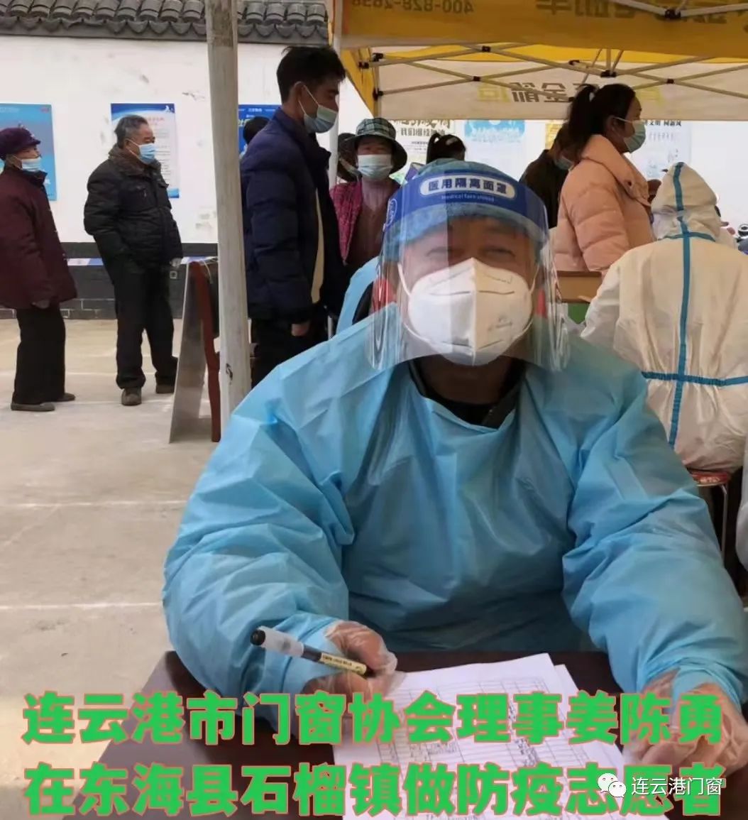 ? ? ? 連云港市門(mén)窗協(xié)會(huì)理事(東海百勝門(mén)業(yè)總經(jīng)理)姜陳勇在東海縣石榴鎮(zhèn)做自愿者參與抗疫工作。