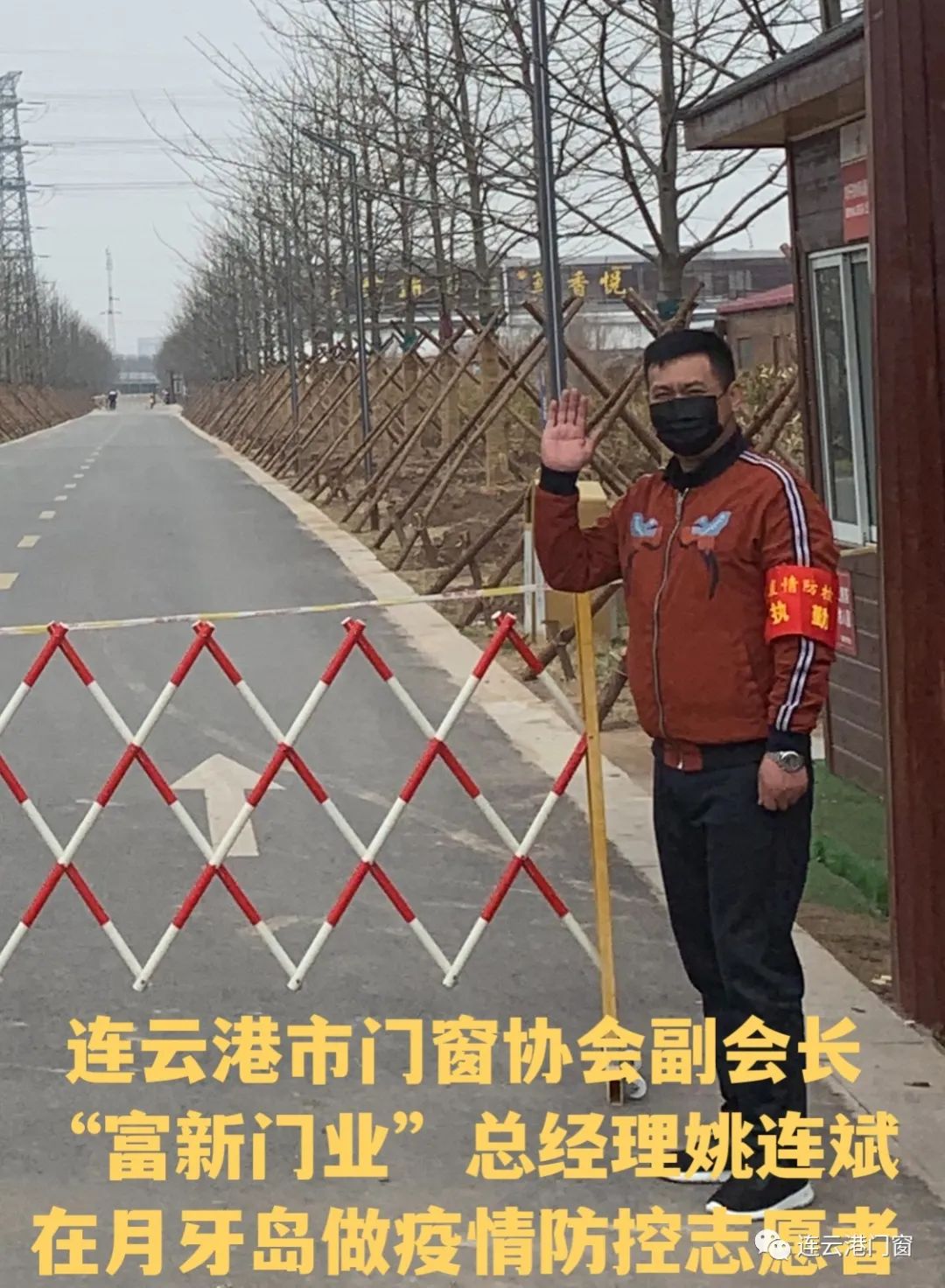 ? ? ? 連云港市門(mén)窗協(xié)會(huì)副會(huì)長(zhǎng)(富新門(mén)業(yè)總經(jīng)理)姚連斌在月牙島做志愿者參與抗疫工作。