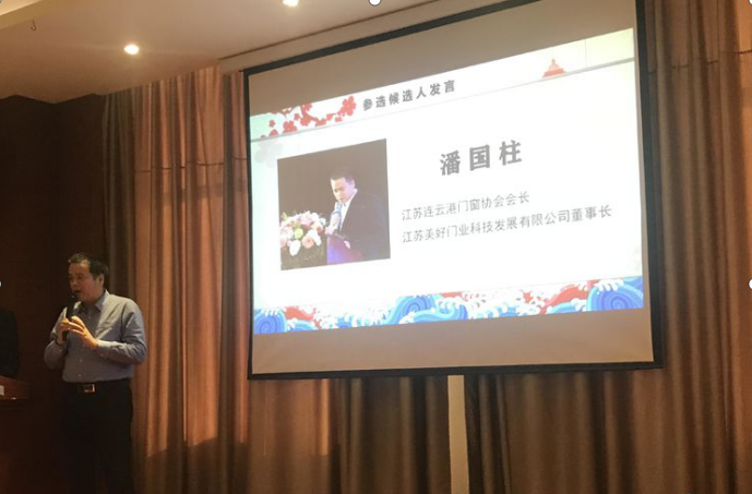 ? ? ? 連云港市門窗協會黨支部書記、會長、江蘇美好門業科技發展有限公司董事長潘國柱,當選第三屆全國建筑門窗行業協會戰略聯盟主席并發表就職致辭。
